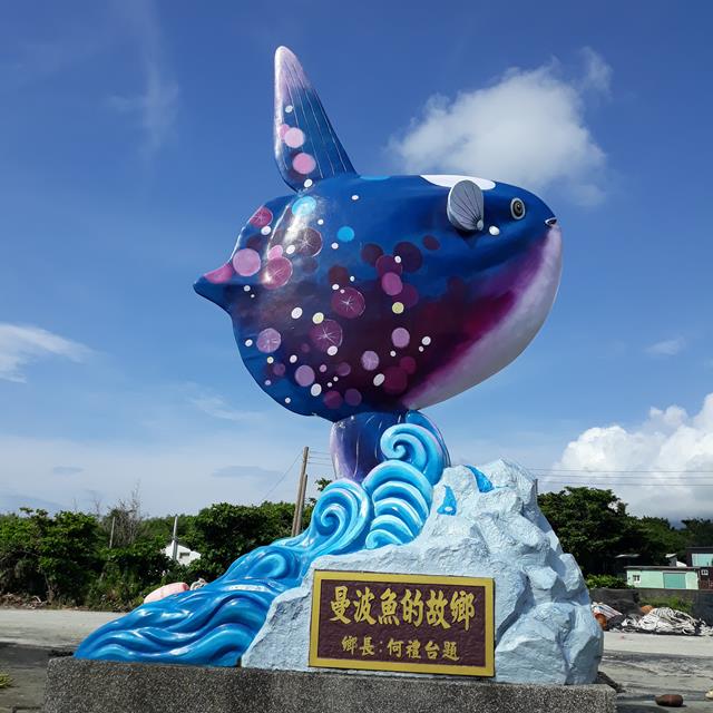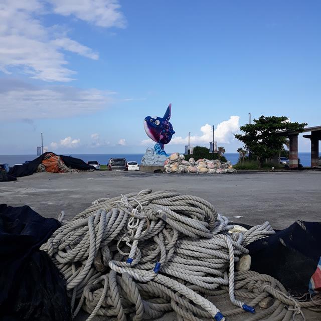 從背面看曼波魚石像,可以看到有漁民正在曬定置漁網。
