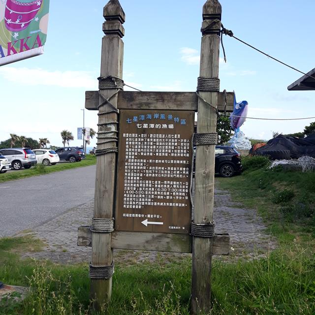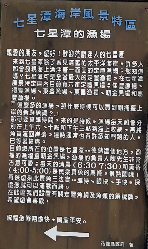 七星潭的魚場看板。 這兒的魚場稱之為定置魚場,是一種將漁網固定在洋流中的捕魚方式。 在柴魚博物館中有詳細的介紹。