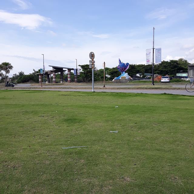 從草皮可以看到曼波魚石像與曼波魚涼亭。