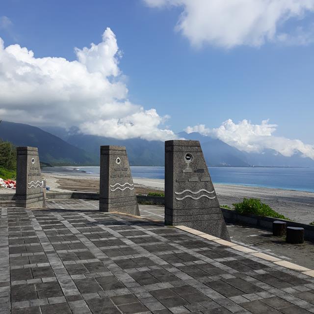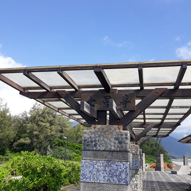 沿著濱海自行車道向北走,最後就會來到七星亭觀海平台。 這邊可以看到漁民們用於定置漁網的網子,並有一座曼波魚的藝術石像。 這邊可以看到一個泊區斜坡,可以讓漁船入海。 七星亭觀海平台除了七星亭與觀海平台外,還有設置藝術石雕可以拍照。